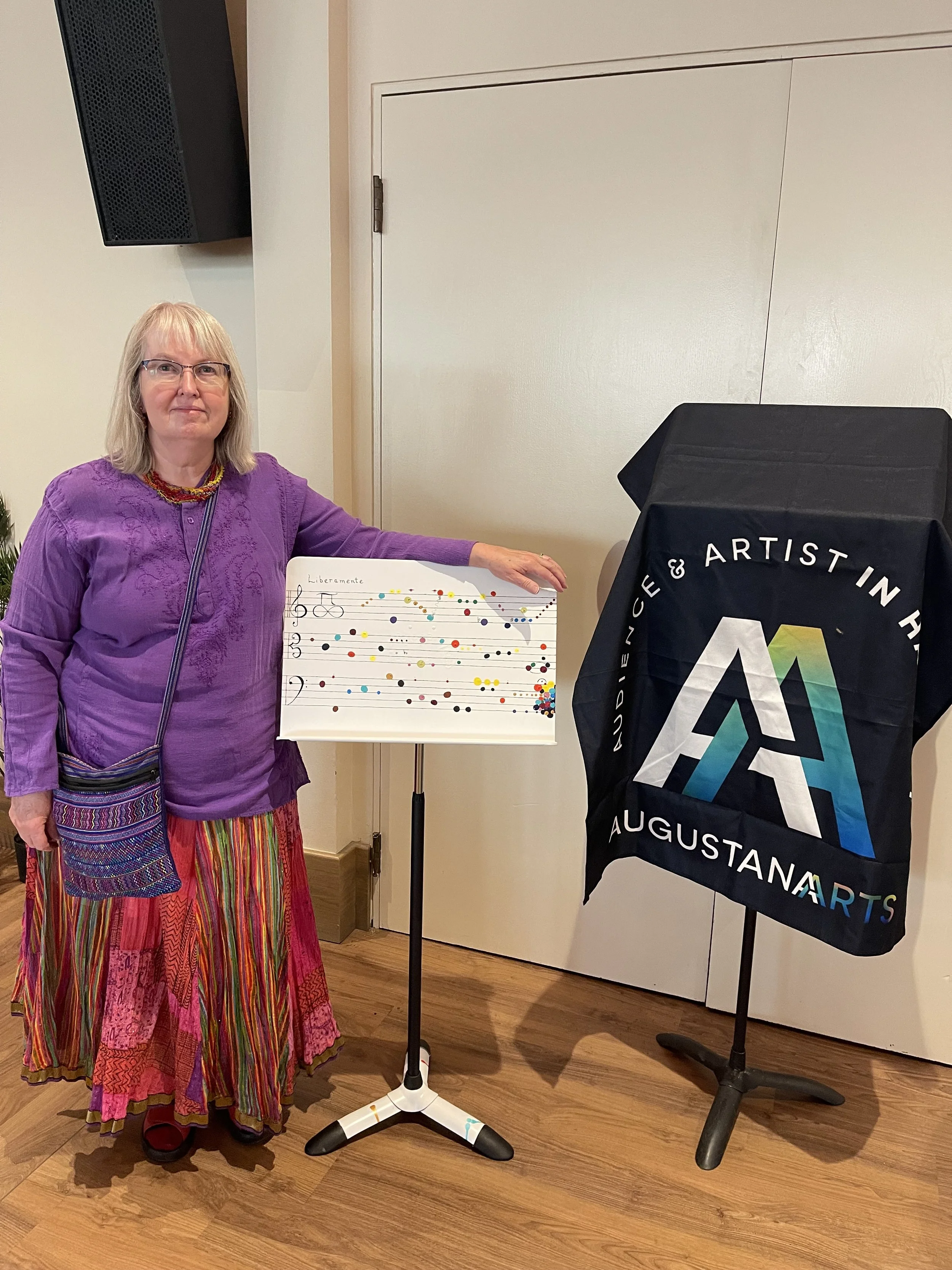 After painting it, I played it on the piano. The tenor clef was a bit of a challenge, as I usually play treble or bass. I added a few accidentals (sharp, flat) to 'improve' the piece. The hold at the end caused the free-floating notes to pile up. What to do? Continue on the back ! Let the hold explode! Notes fly chaotically, some dripping onto the feet of the stand.